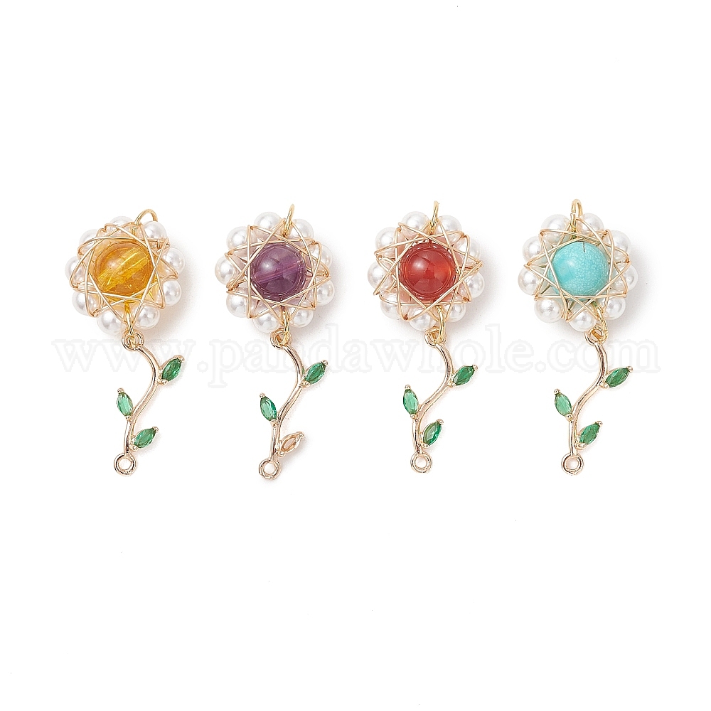 4 шт. 4 стили латунные микро-паве кубические цирконии соединительные подвески, Подвески-коннекторы в виде цветов из натуральных и синтетических драгоценных камней, обмотанные проволокой., с жемчугом из раковины
