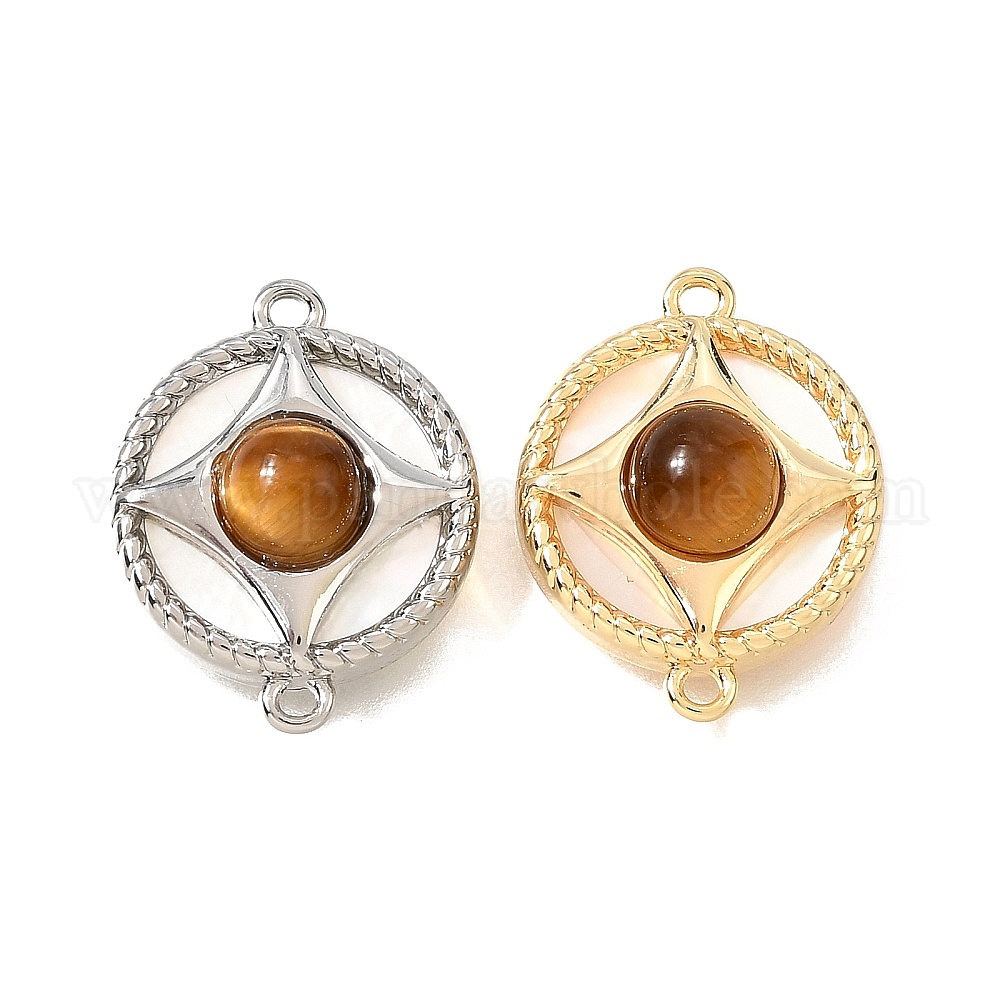 • Настоящее золото 18K Подвески-коннекторы из натурального тигрового глаза и натуральной раковины, выполненные из латуни, плоские круглые звенья., реальный 18 k позолоченный, 19x15x5.5~6 мм, отверстие : 1.2 мм