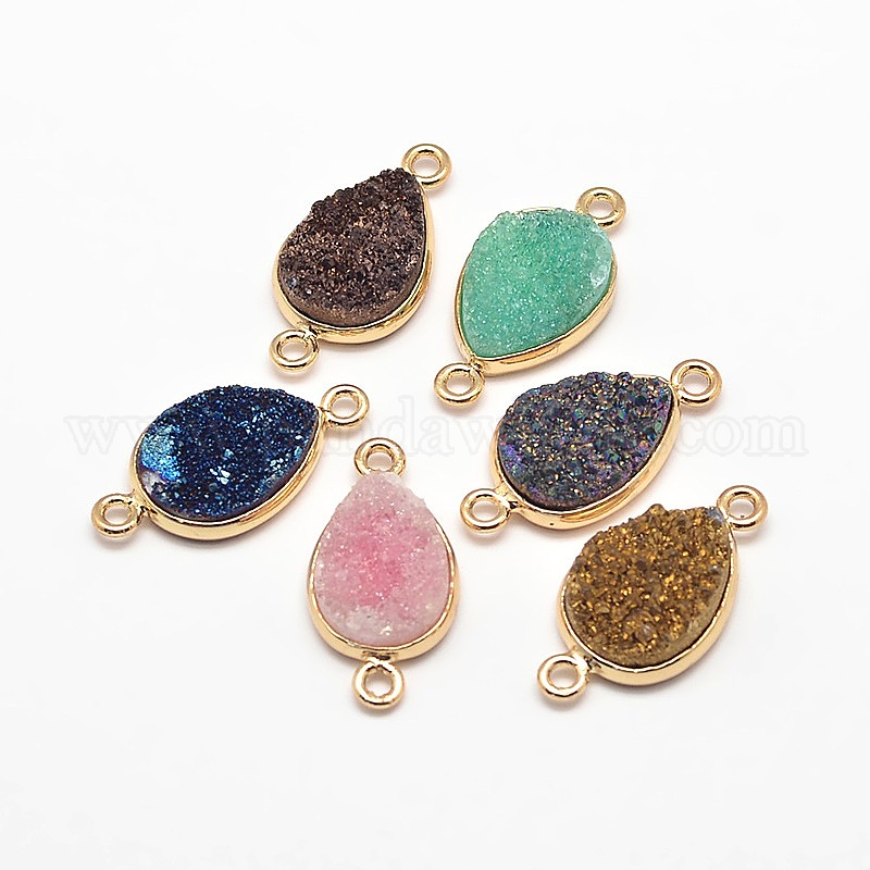 Гальваническое покрытие из натуральных друзовских кристаллов, с фурнитурой латунной золотого тона, окрашенные, 23x12x4~6 мм, отверстие : 2 мм