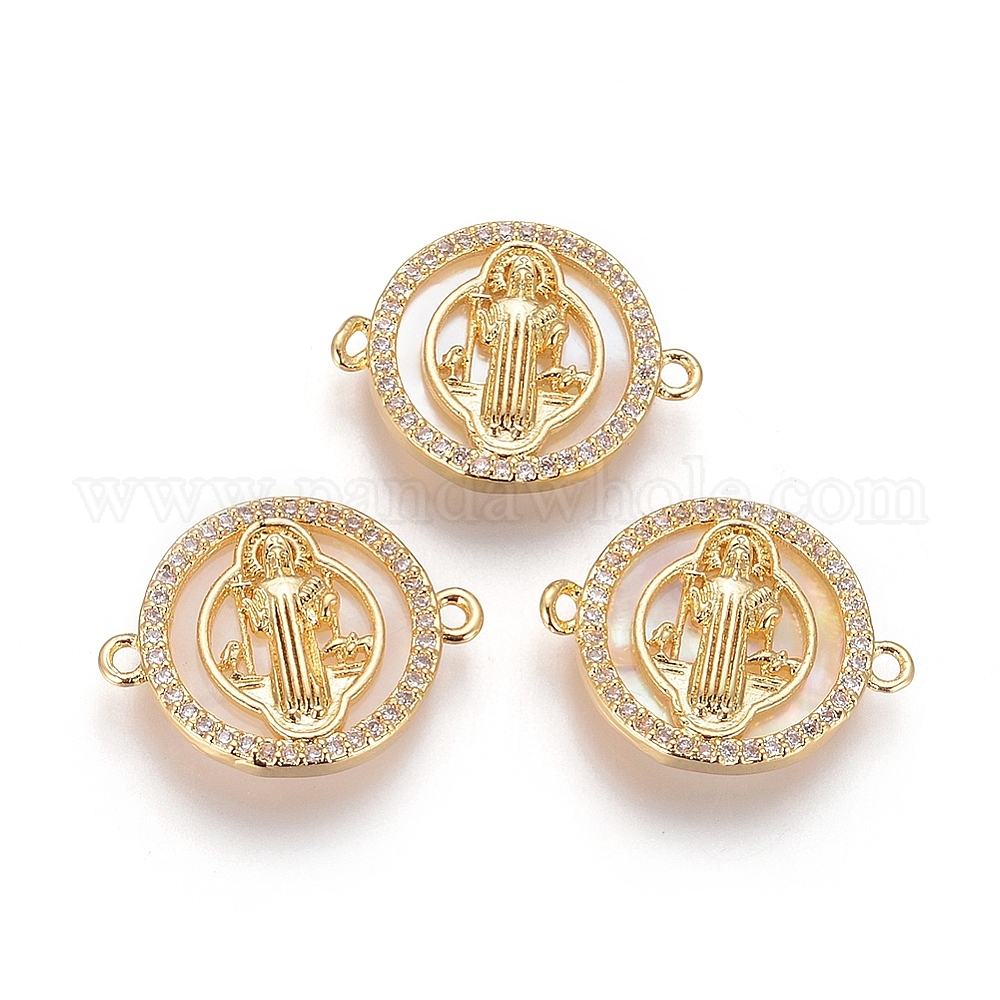 Соединители из латуни с микропаве и кубическим цирконием, с оболочкой, плоские круглые с Девой Марией, прозрачные
