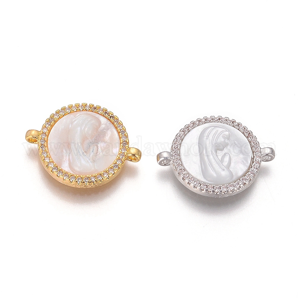 Соединители из латуни с микропаве и кубическим цирконием, с оболочкой, плоские круглые с Девой Марией, прозрачные