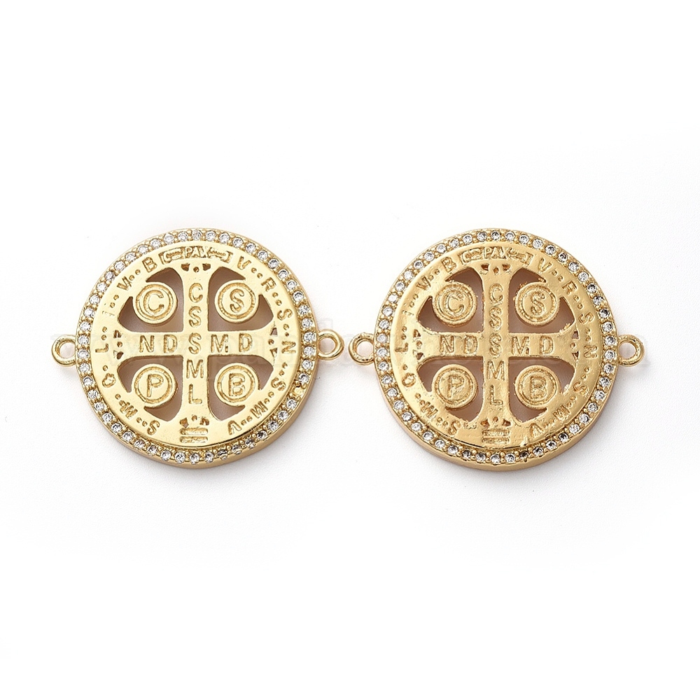 Золотые тона латунь микропаве из кубического циркония, плоский круг с крестом и словом