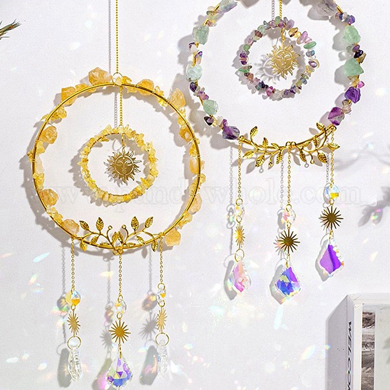Кольцо с кусочками драгоценных камней в проволочной обертке, украшение с подвеской, подвесные ловцы солнца, с металлической подвеской-солнцем и подвеской в виде стеклянного листа, для украшения дома