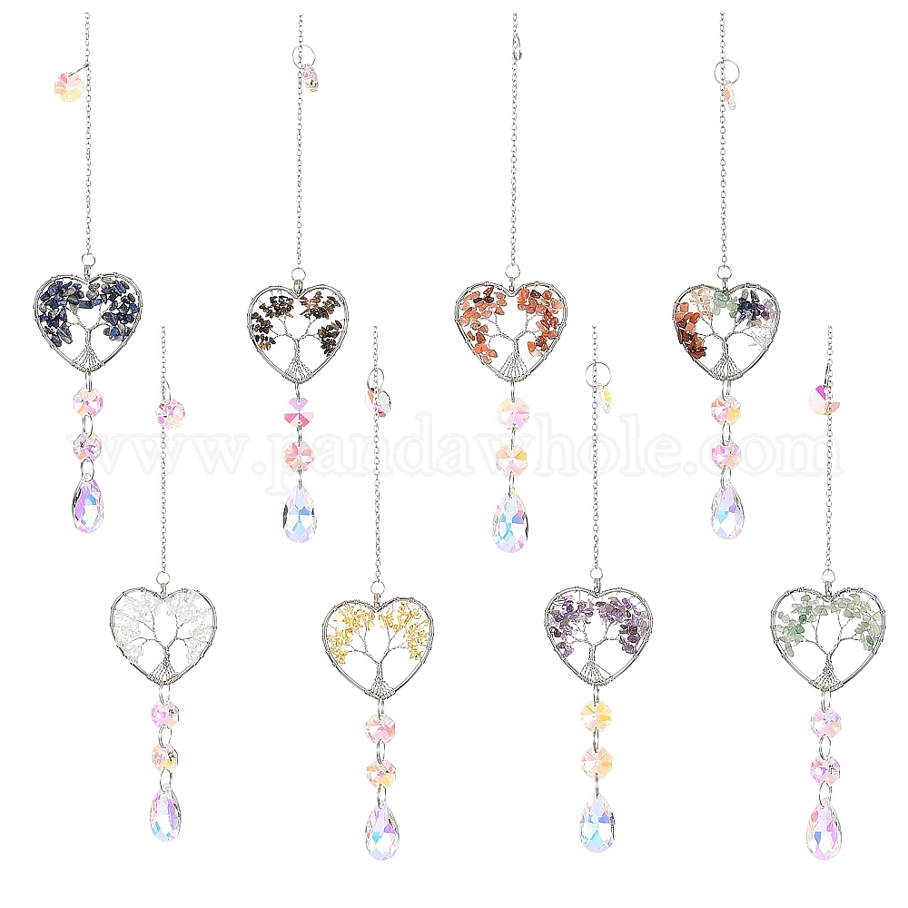 Обернутое проволокой сердце из натуральных драгоценных камней с подвеской в виде дерева жизни, стеклянные каплевидные кисточки для ловли солнца для оконных подвесных украшений