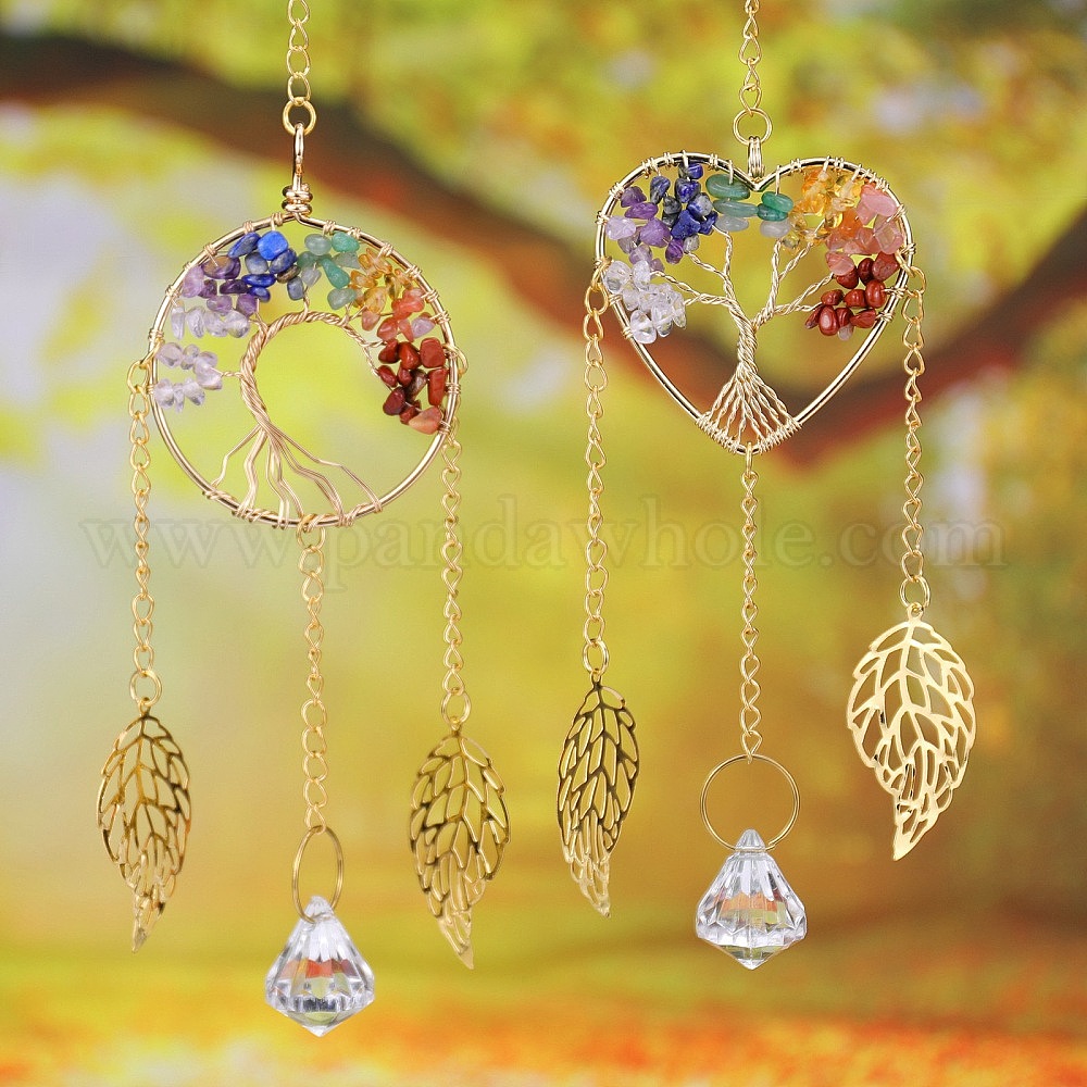 Чакра натуральный драгоценный камень чипсы проволочная обертка металл дерево жизни подвесные украшения, листья и стеклянные кисточки ловцы солнца украшения для дома и сада на открытом воздухе