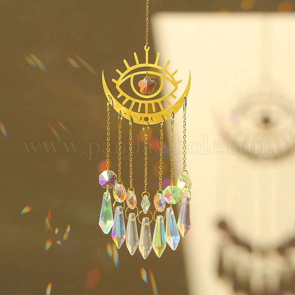 Латунные с железной цепью подвесные украшения, Стеклянные ловцы солнца с кисточками для садовых наружных подвесных украшений, золотые