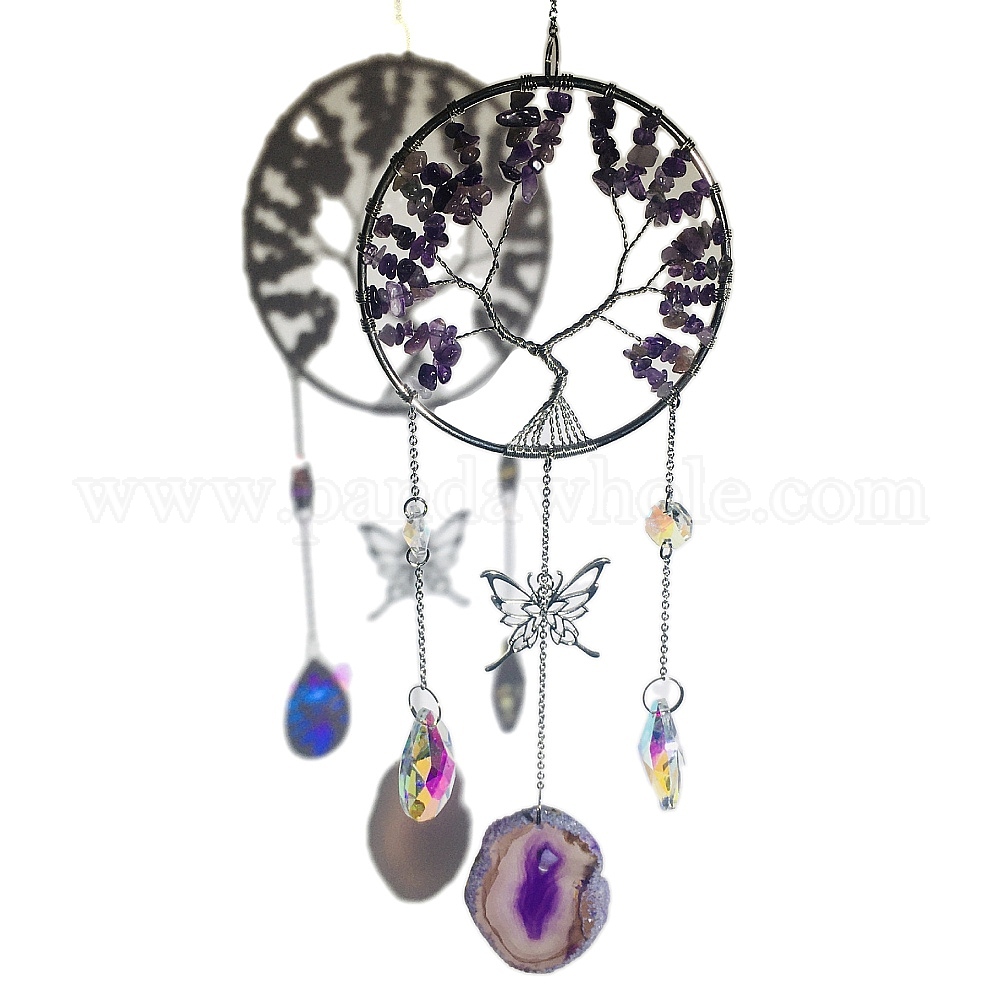 Проволочная обертка из натуральных драгоценных камней подвесные украшения из дерева жизни, Ловушки солнца из натурального агата и стеклянных кисточек для украшения сада на открытом воздухе