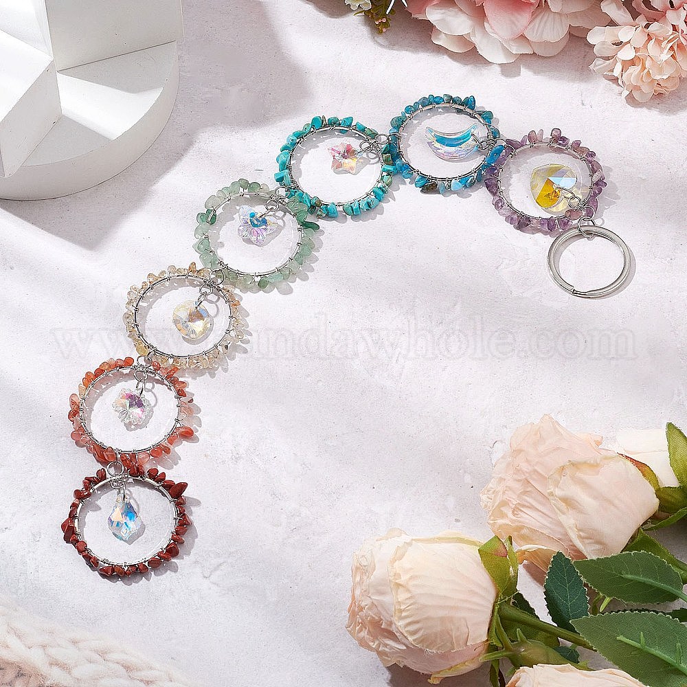 Проволочная чакра натуральный драгоценный камень чипсы кольцо подвесные украшения, Стеклянные ловцы солнца с кисточками для украшения сада на открытом воздухе