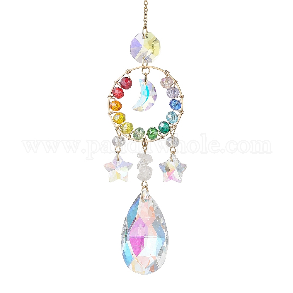 • Золотой Подвесные солнцезащитные устройства из стекла с натуральным кварцевым кристаллом, подвески в форме капли, звезды и луны для наружного и садового декора, золотые, 263 мм