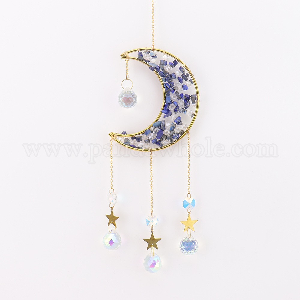 • Ляпис-Лазурь Ловец солнца в форме луны, обмотанный медной проволокой из натурального лазурита., Подвесное украшение для окна в виде звезды из стекла для дома., 485x87x22 мм