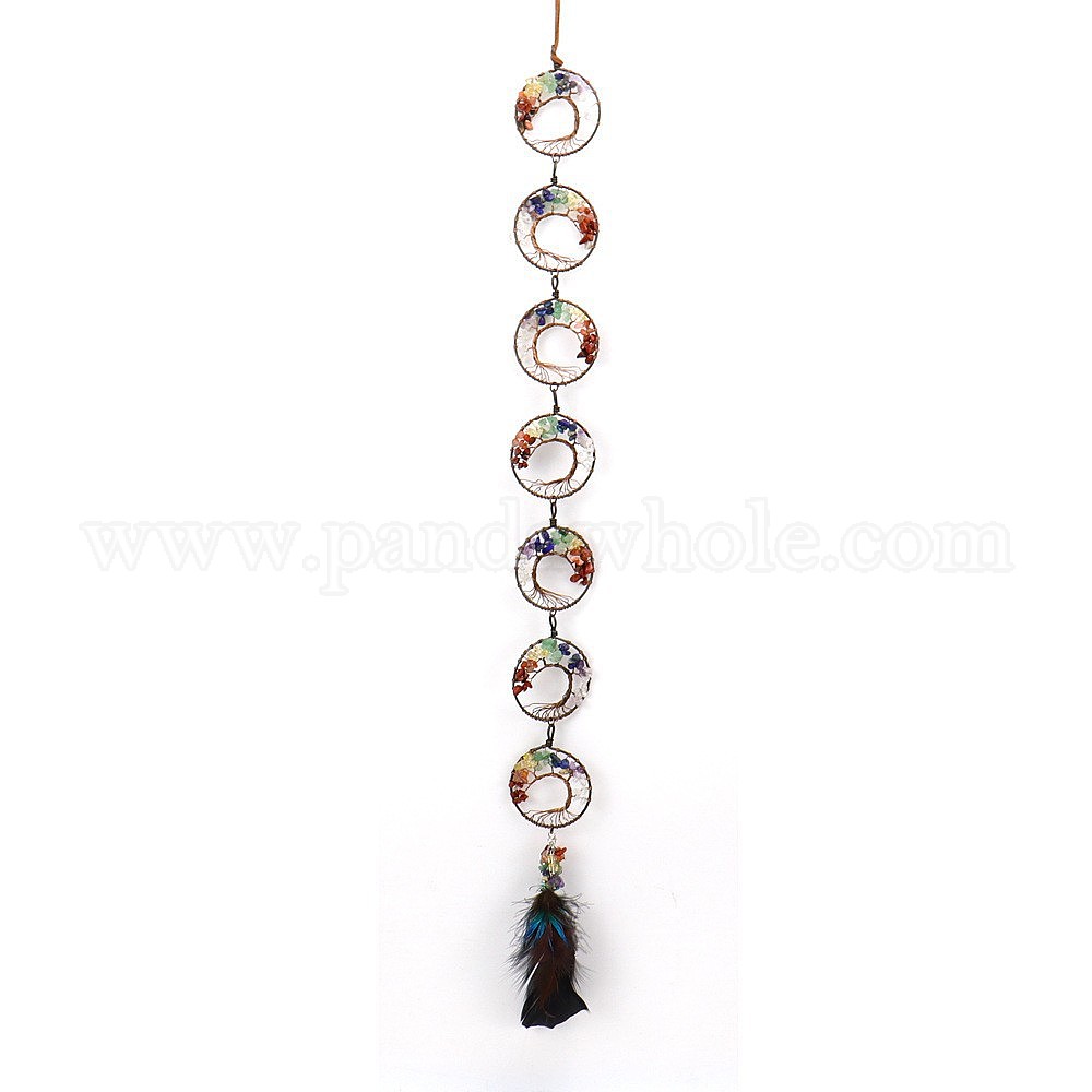 Ловцы солнца в виде дерева жизни, обмотанного латунной проволокой, с натуральными смешанными драгоценными камнями., 7-кольцо для подвешивания на окно с перьевой кисточкой