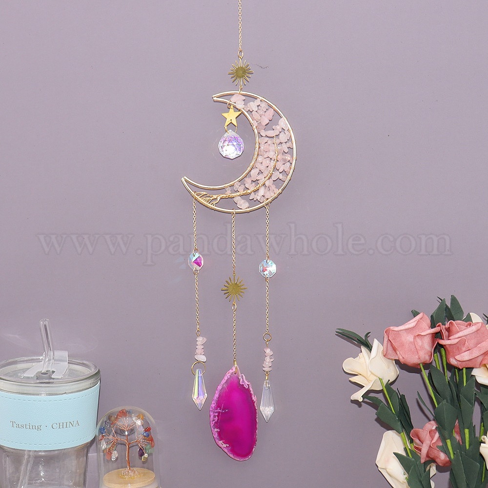 • Розовый Кварц Ловец солнца в форме луны, обмотанный медной проволокой из натуральных кусочков розового кварца., Декоративное украшение для окна из стекла и среза агата для дома., 580x38x8 мм
