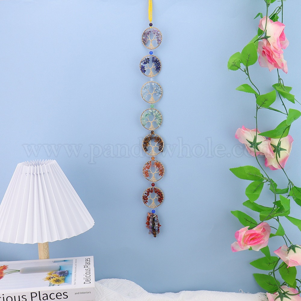 Подвески-ловец солнца в виде дерева жизни, обмотанные латунной проволокой, с изображением чакр и кусочками натуральных камней., для украшения окон