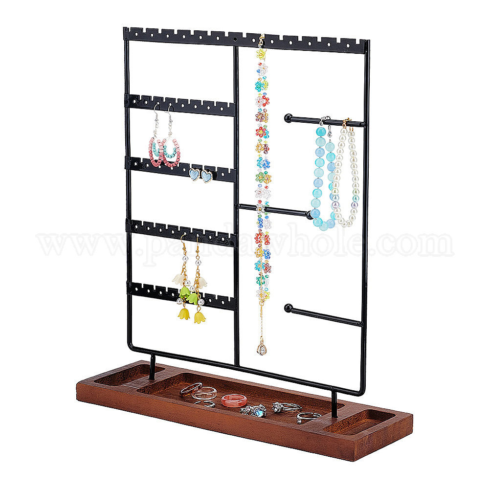 • Electrophoresis Black Выставочные витрины набора украшений утюга, держатель органайзера для ювелирных изделий, с основанием из коричневой древесины, для сережек, Браслеты, хранение ожерелий, электрофорез черный, готовое изделие: 30x9.5x34 см, о 2 шт / комплект
