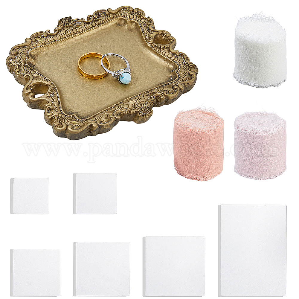 6шт. 6 размеры прозрачные акриловые подставки для демонстрации, квадрат и прямоугольник, с 3 рулонами 3 разноцветной полиэстерной лентой с необработанными краями и 1 шт. винтажных прямоугольных декоративных элементов из смолы для подносов., реквизит для фотосессий ювелирных изделий