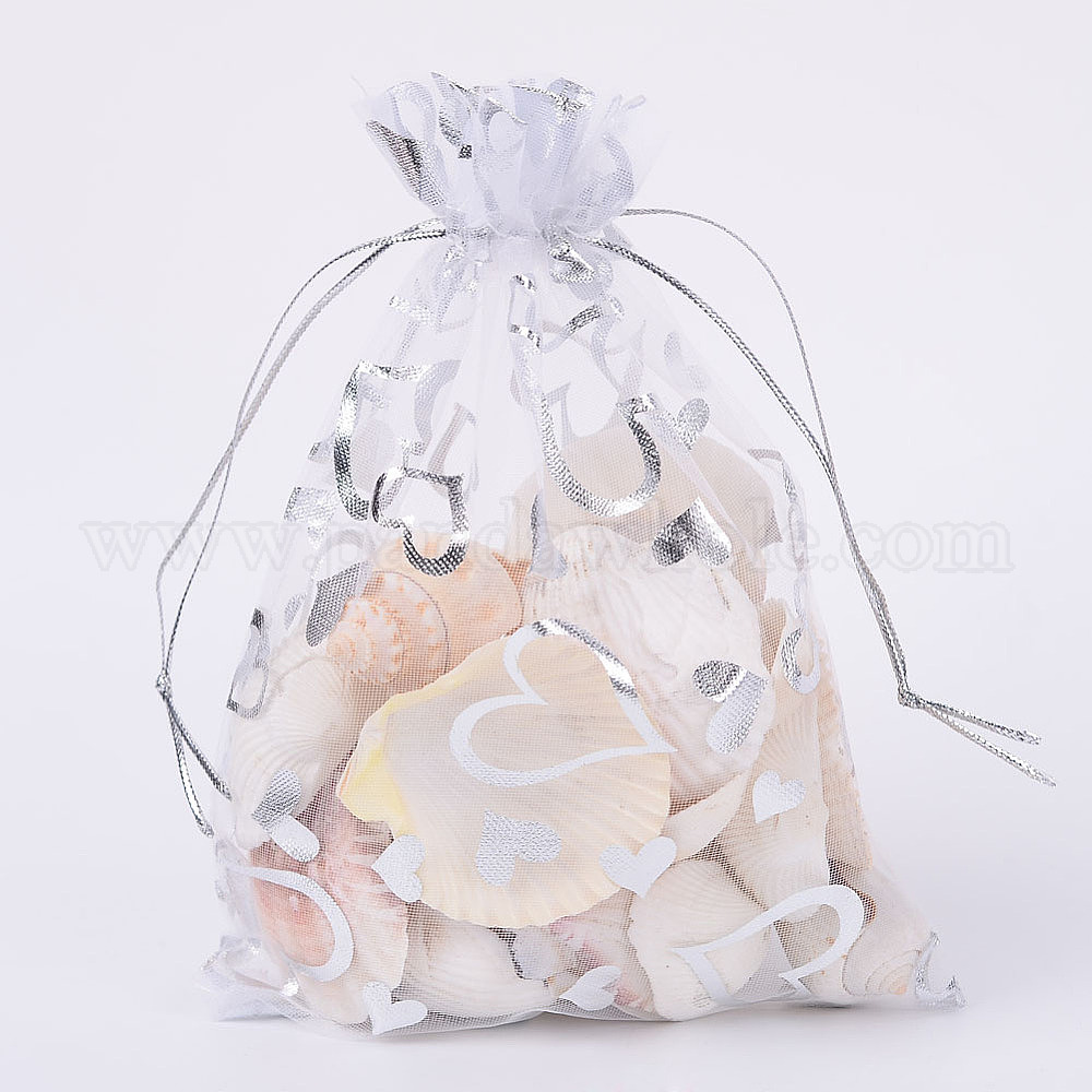 • Белый 100 шт. подарочные пакеты из органзы с серебряным тиснением в форме сердца, Ювелирные подарочные сетчатые мешочки на шнурке для свадебной вечеринки, рождественские конфетные сумки, свадьбы пользу сумки, прямоугольные, белые, 18x13 см