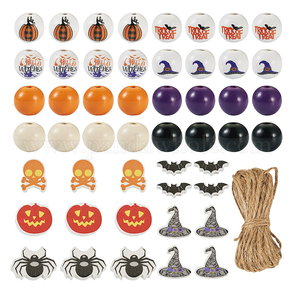 13 стили Хэллоуина, натуральные деревянные бусины, окрашенные распылением, разнообразные, с джутовым шнуром 5m