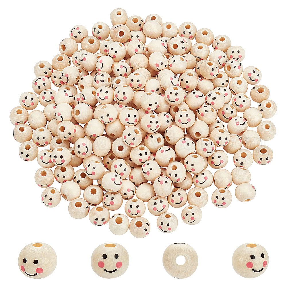 250шт. деревянные бусины с принтом, круглый с рисунком улыбающегося лица, неокрашенными