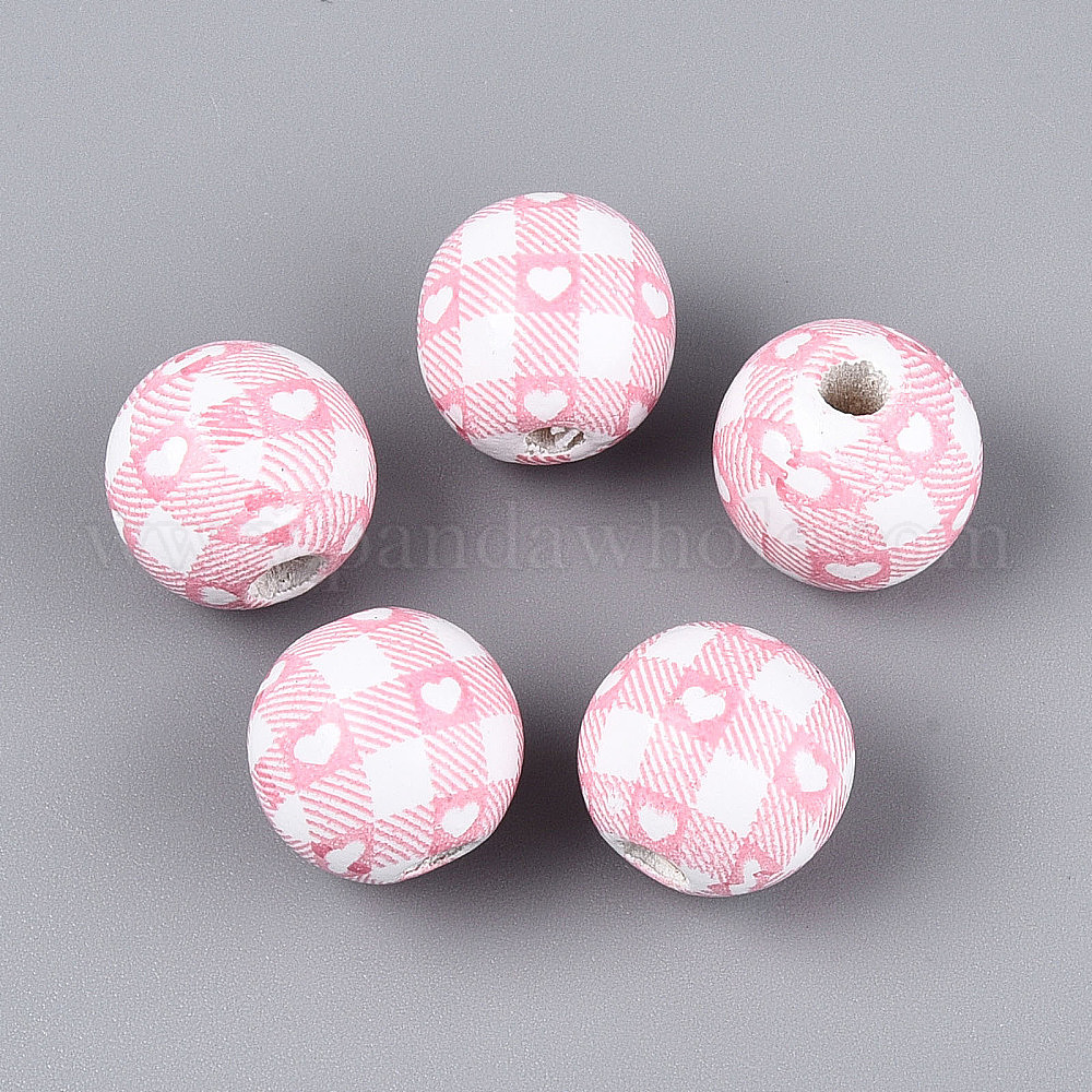 • Pink Набивные шима деревянные бусины, круглые с сердца шаблона, розовые, 14.5~15.5 мм, отверстие : 3~4.5 мм