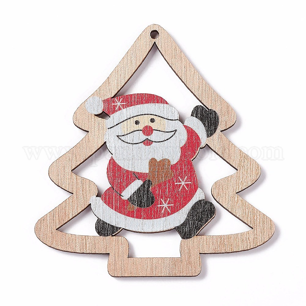 • Разноцветный Напечатаны деревянные большие кулоны, Рождественская елка с Дедом Морозом, красочный, 79.5x74x2.5 мм, отверстие : 2.5 мм