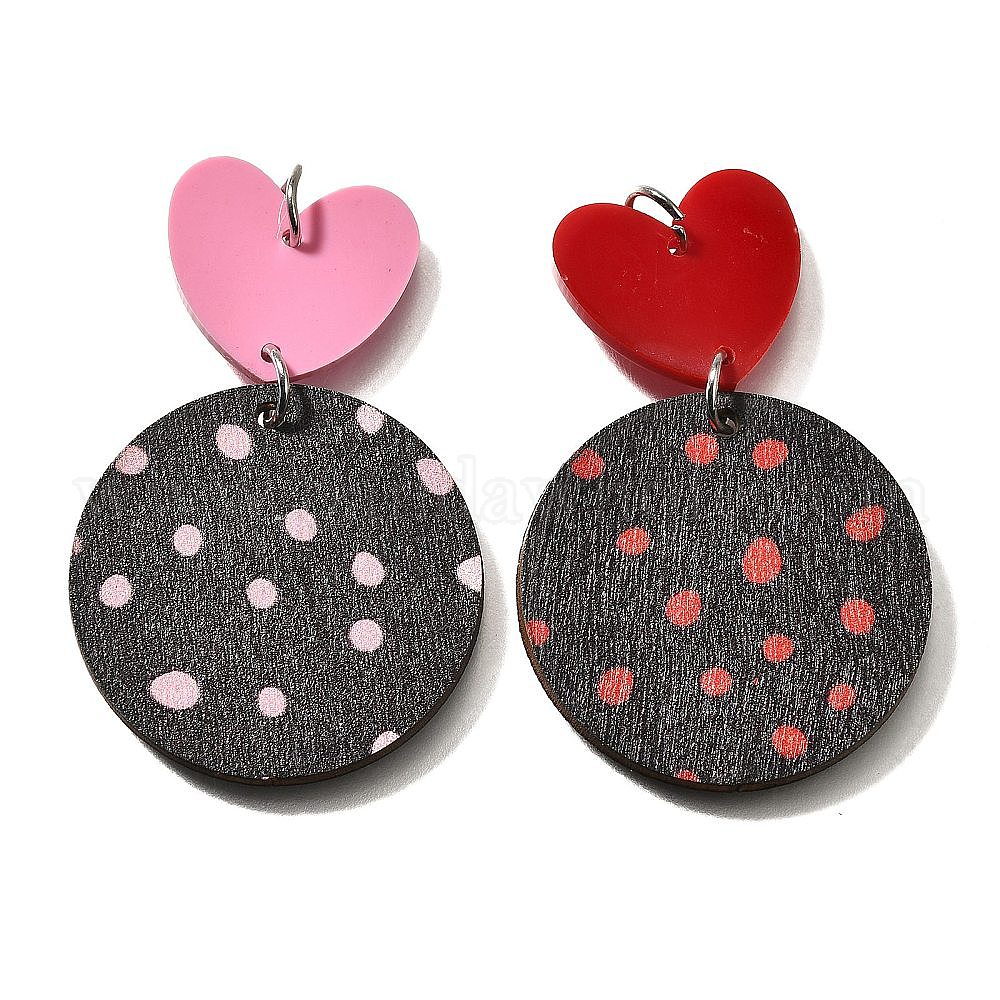 Подвески из тополя, плоский круглый с узором в горошек и подвесками в виде сердечек, с акриловой и платиновой петлей