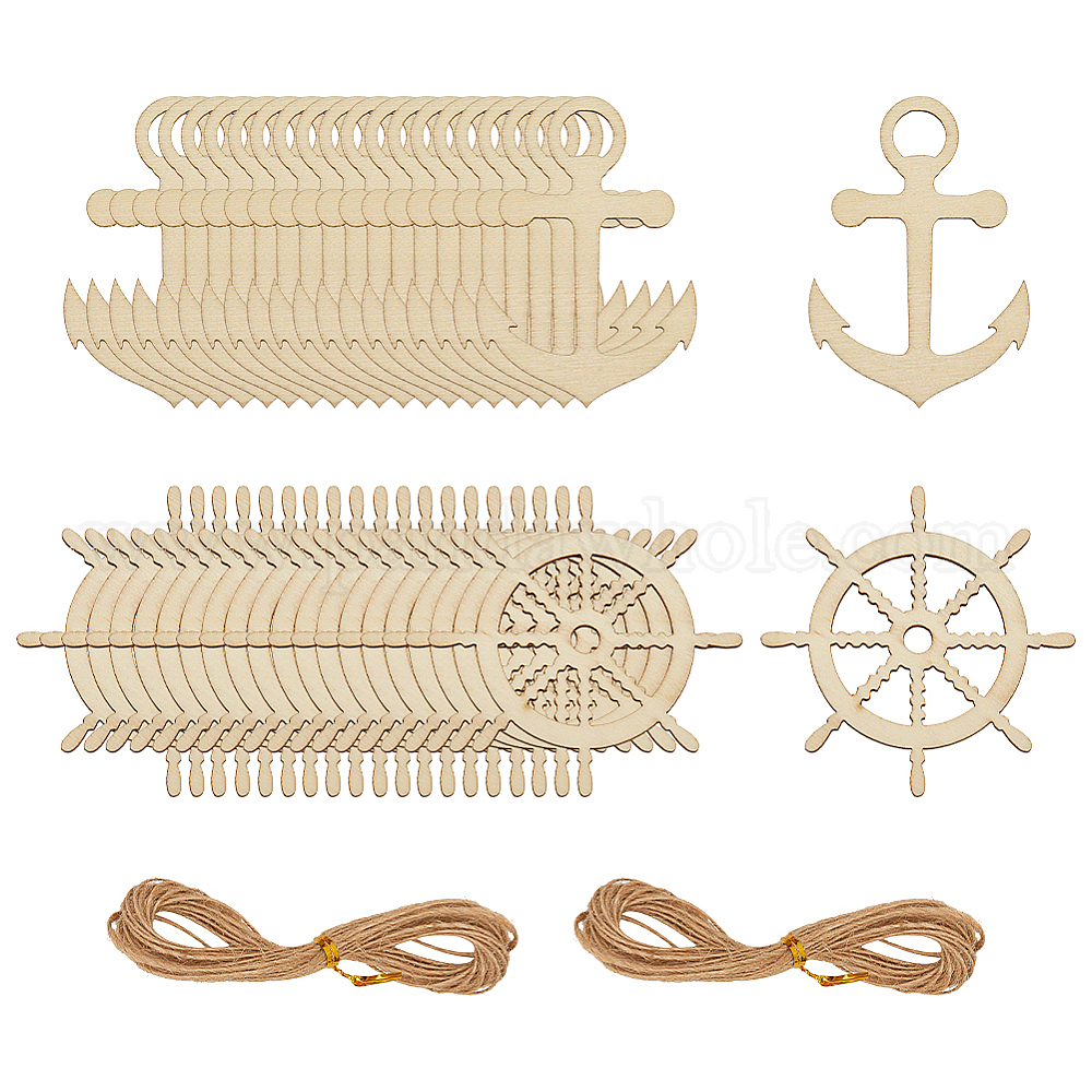 40шт 2 стили большие подвески из морского дерева, неокрашенными, подвески для якоря и руля, с 2 пучками джутового шпагата