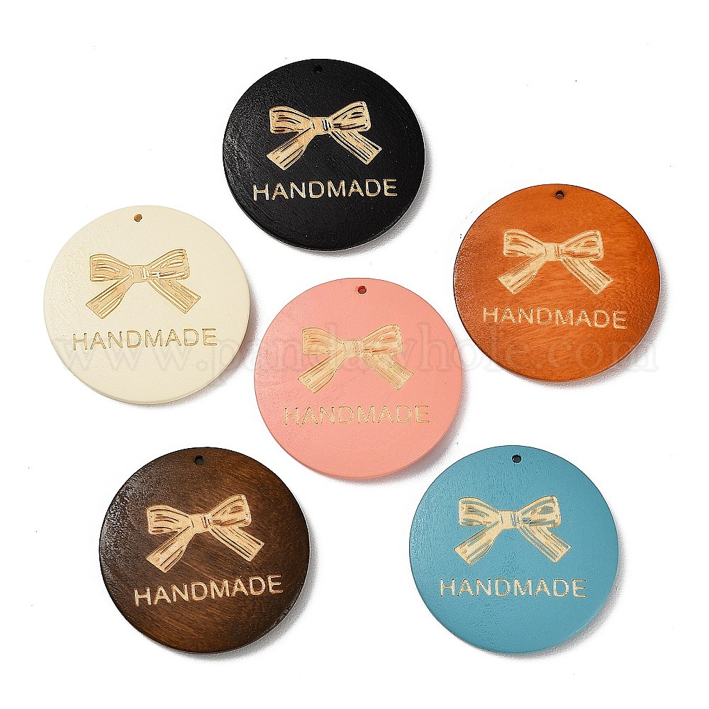 • Бежевый Древесины подвески, плоские круглые подвески с надписью "ручная работа", бежевые, 39.5~40.5x5~5.5 мм, отверстие : 1.4 мм