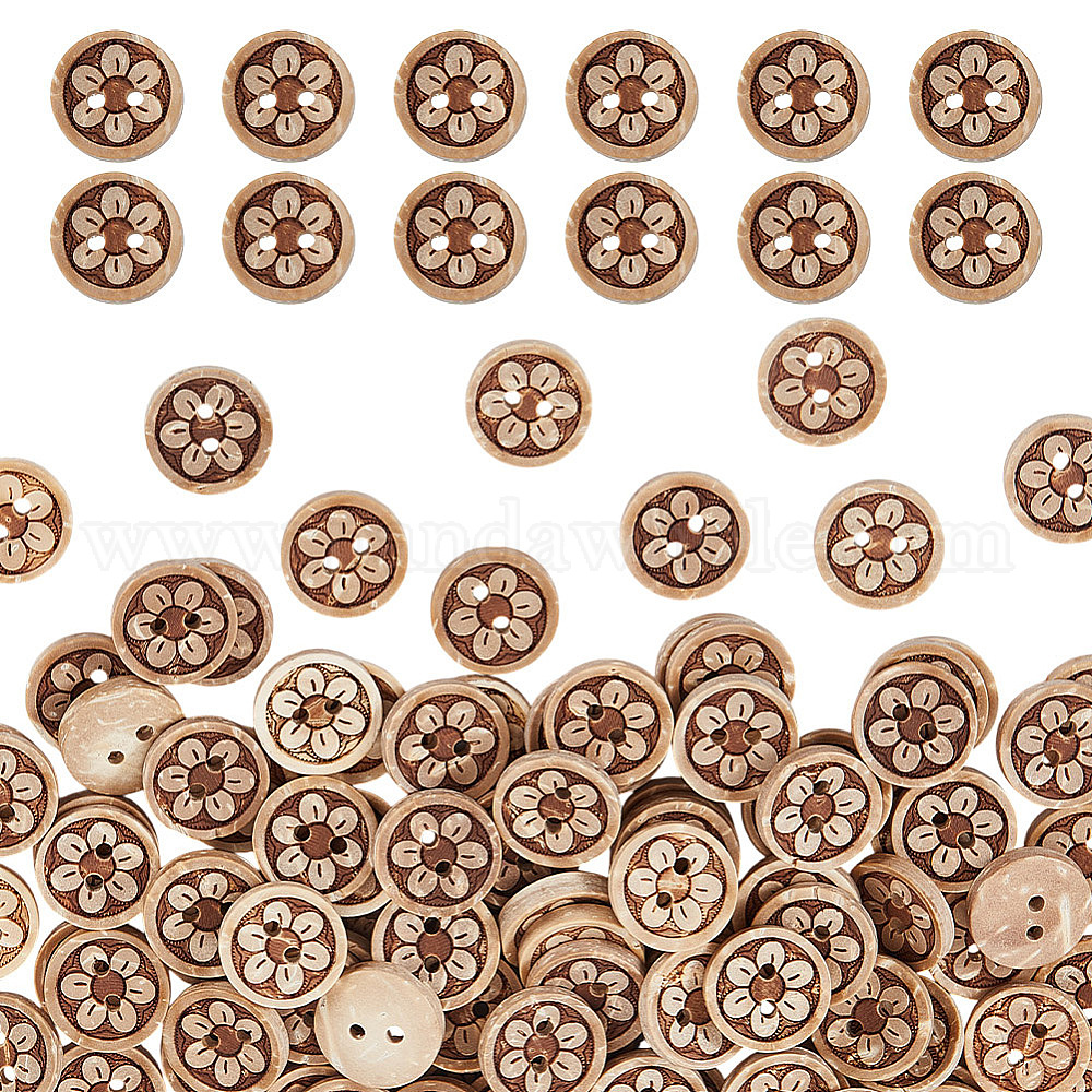 200шт. пуговиц из кокосовой скорлупы, 2-луночное, плоские круглые с цветочным узором