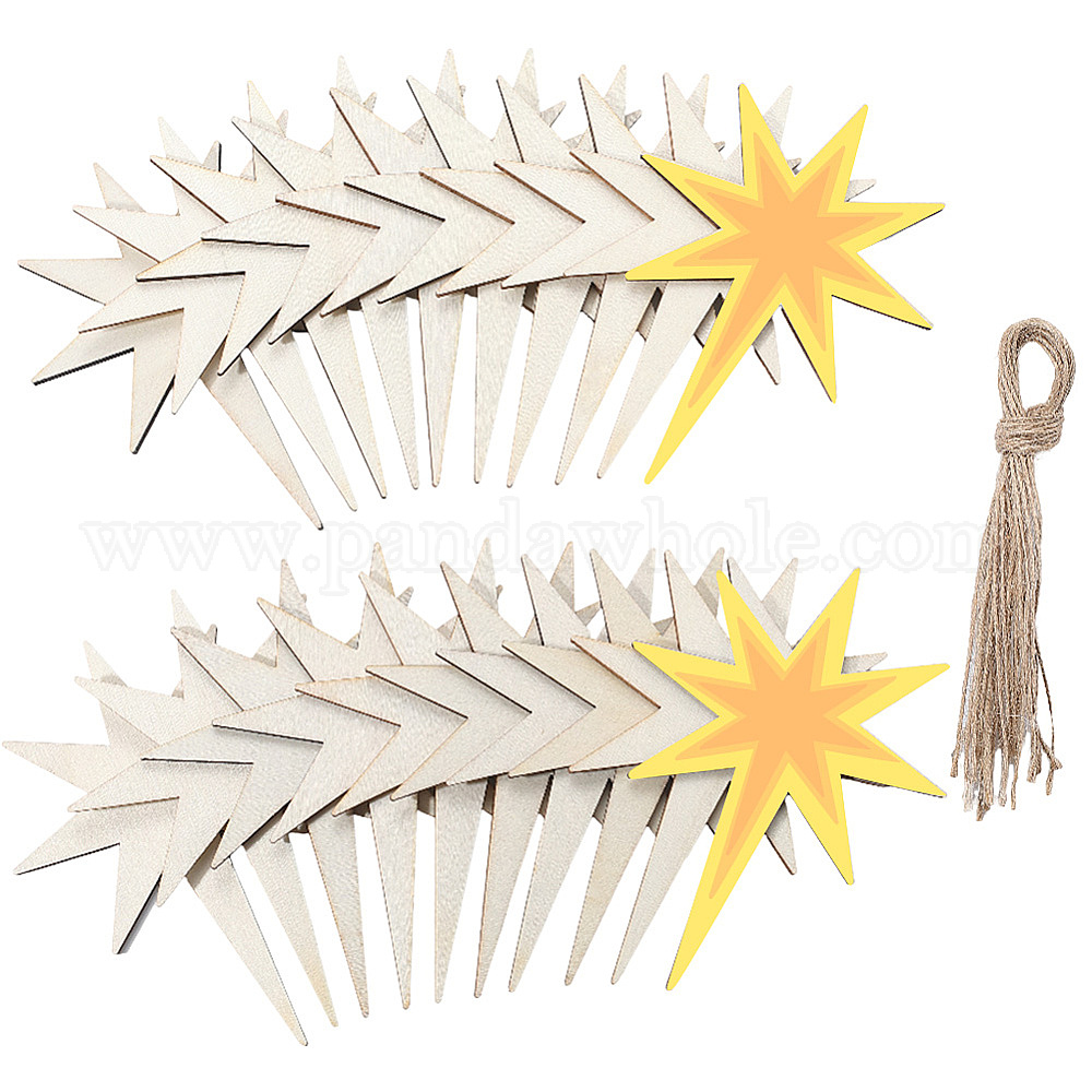 40шт. незаконченных деревянных подвесок в форме звезд для художественной росписи, пирография, домашнего декора, с джутовым шнуром 40шт.