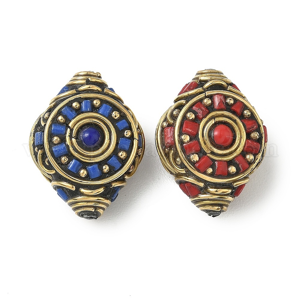 Ручной тибетском стиле бисера, ромб, с латунными находками и синтетической бирюзой, античное золото