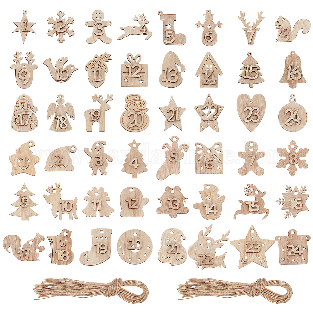 • Дерево 2 наборы 2 стили рождественский адвент календарь цифры деревянные цифры подвесные украшения, деревянная цифра 1-24 новогодняя поделка, для украшения елки, с джутовой веревкой, веревки: 1 мм, подвески: 31.5~45x30~43.5x5.5 мм, отверстие : 2 мм, 1 набор / стиль