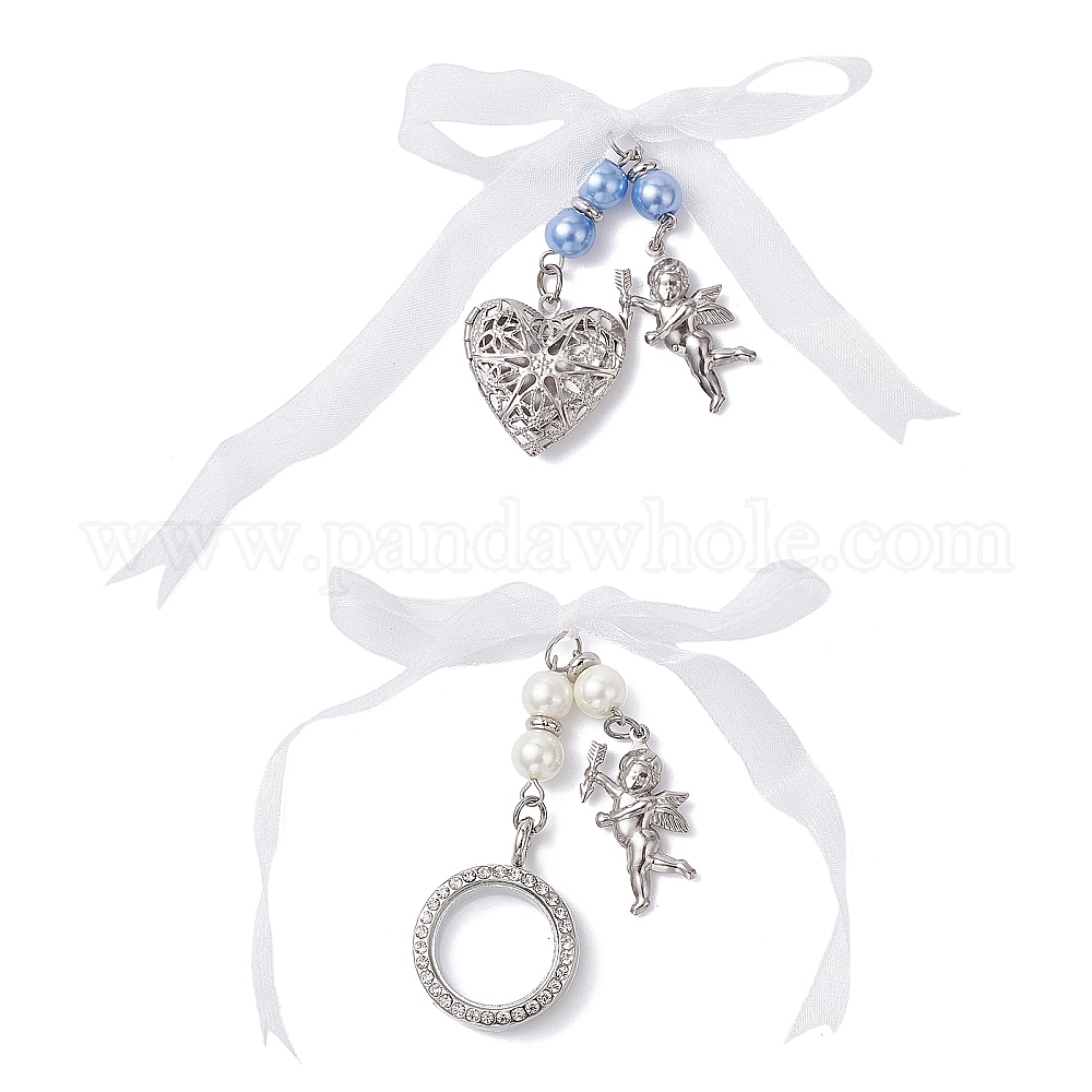 Подвеска-медальон для свадебного букета в форме сердца и плоского круглого камня из нержавеющей стали и сплава, со стеклянными жемчужными бусинами и лентой из органзы с бантом