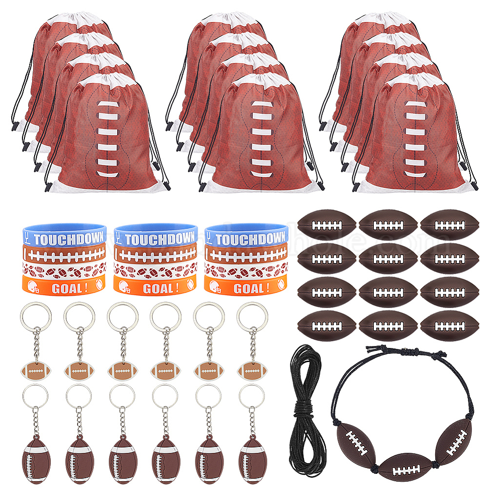 Украшения для вечеринки в стиле регби, включая силиконовый шнурок для браслета на запястье, Полиэстеровые сумки для хранения вещей для регби, Брелок-подвеска из ПВХ с железным кулоном в виде мяча для регби., брелки из пвх, силиконовые бусины (0382Z3)