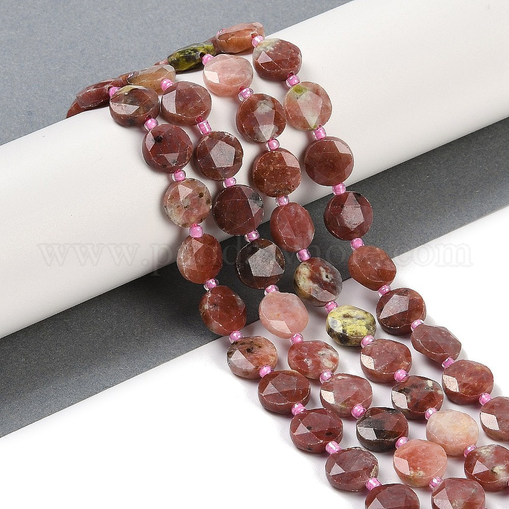 Натуральные нити из яшмы в цвету сливы, граненый пятиугольный разрез, плоско-круглые, с бисером
