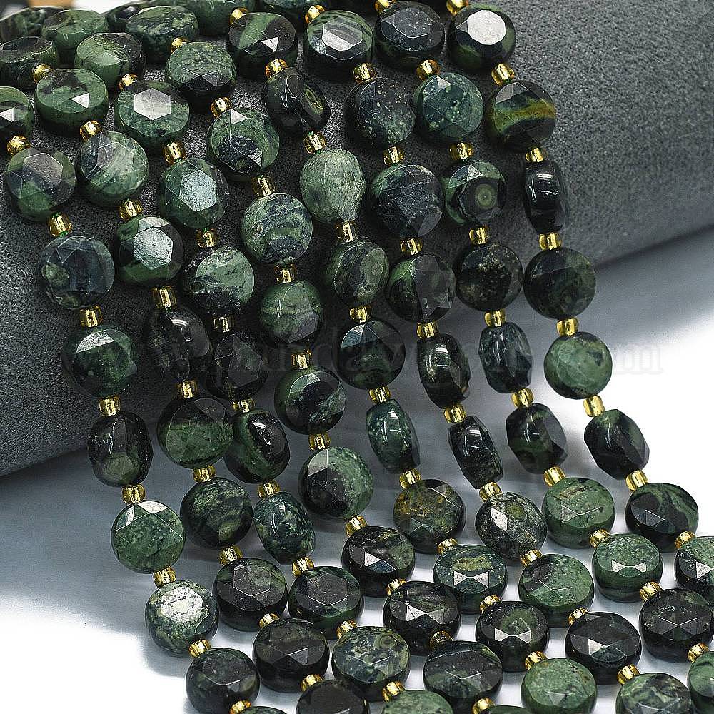 Нити бусин из натуральной зеленой яшмы камбаба, граненый шестиугольный разрез, плоско-круглые, с бисером
