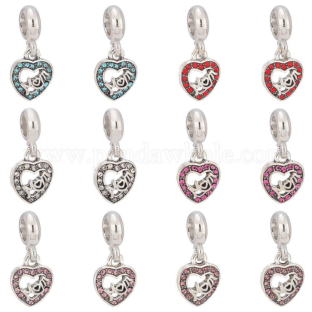 12 шт. 6 цвета день матери сплав горный хрусталь европейские подвески, Подвески с большими отверстиями, античное серебро, сердце со словом мама