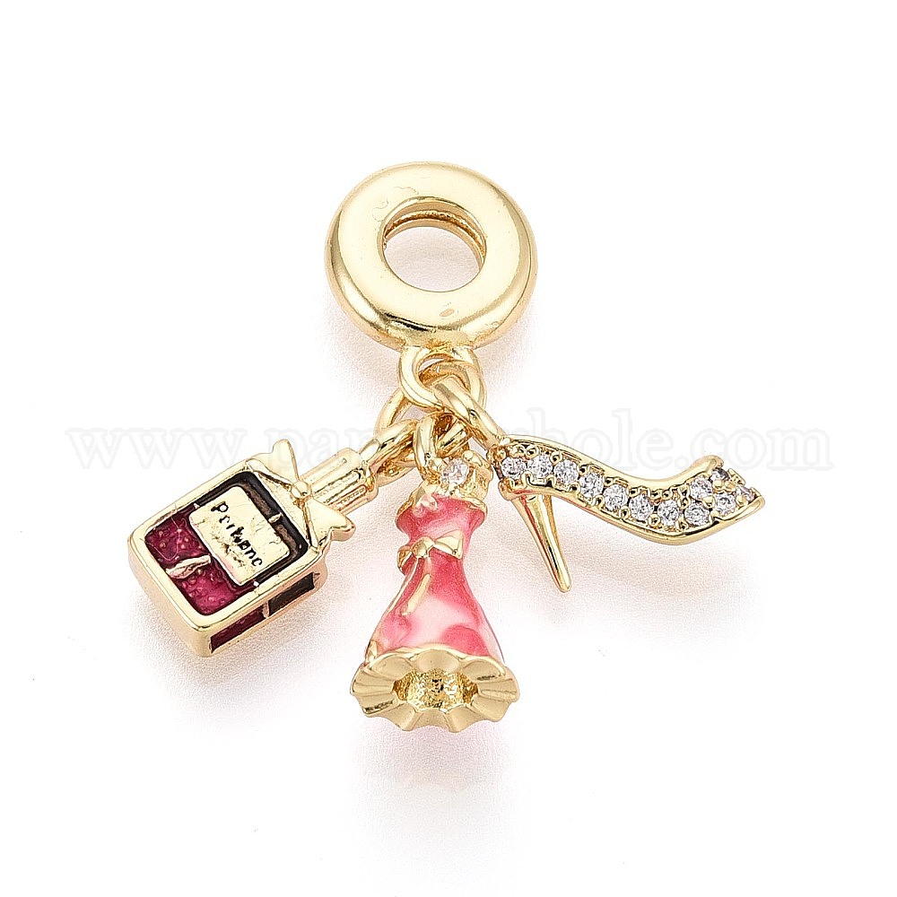 Европейские подвески-шармы из латуни с микропаве из прозрачных кубических цирконий и эмали, флакон духов, платье и туфли на высоком каблуке, Подвески с большими отверстиями, реальный 18 k позолоченный