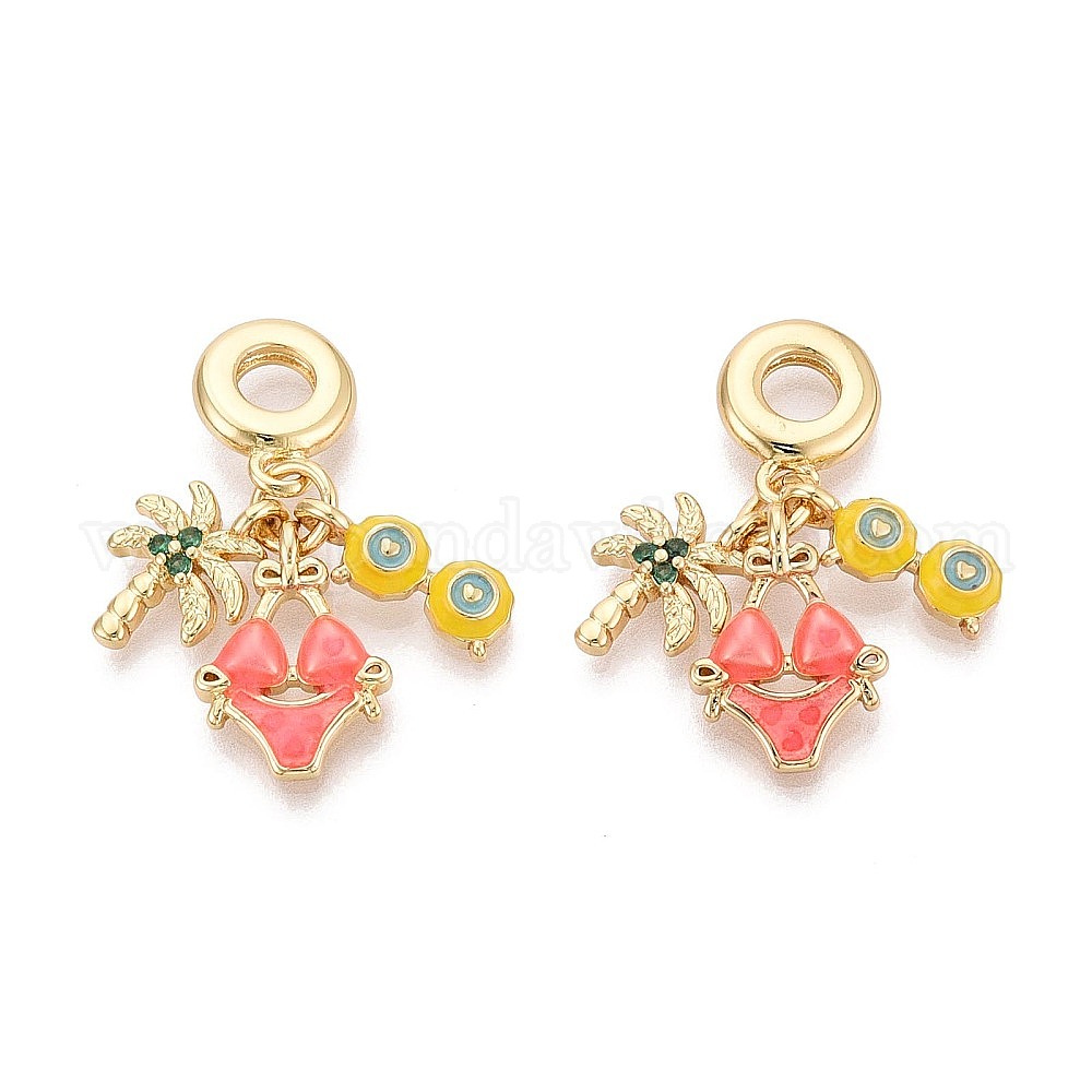 • Ярко-Розовый Европейские подвески-шармы из латуни с микропаве из прозрачных кубических цирконий и эмали, бикини, очки и кокосовая пальма, Подвески с большими отверстиями, реальный 18 k позолоченный, ярко-розовый, 30 мм, отверстие : 4.8 мм