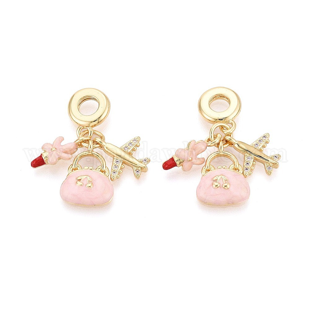 Европейские подвески-шармы из латуни с микропаве из прозрачных кубических цирконий и эмали, сумочка, помада и самолет, Подвески с большими отверстиями, реальный 18 k позолоченный