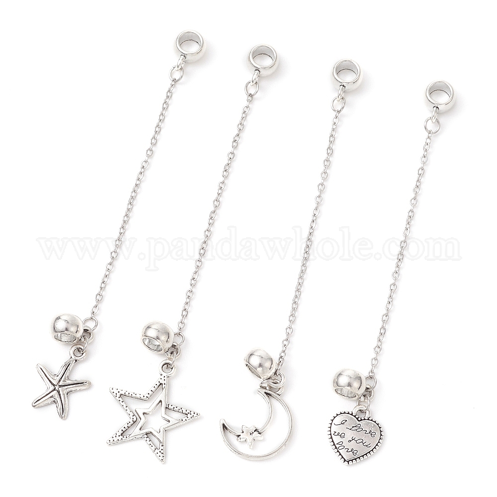 • Античный Серебристый & Цвет Нержавеющей Стали 4 шт. 4 стили 304 европейские предохранительные цепи из нержавеющей стали, с подвесками из сплава в виде звезд и сердец, луны и морских звезд, старинное серебро и цвет нержавеющей стали, 83~85 мм, отверстие : 4.5 мм, 1 шт / стиль