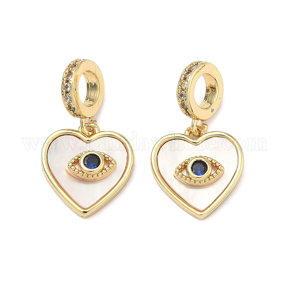 Подвески-шармы из латуни с микропаве, прозрачными и синими кубическими циркониями, в европейском стиле., Подвески в форме сердца с большим отверстием и изображением сглаза, украшенные натуральной ракушкой., стойки покрытие, долговечный, без свинца и без кадмия