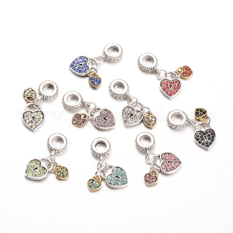 Европейские подвески со стразами из сплава сердца, Подвески с большими отверстиями, старинное серебро и античный золотой, 26 мм, отверстие : 4.5 мм