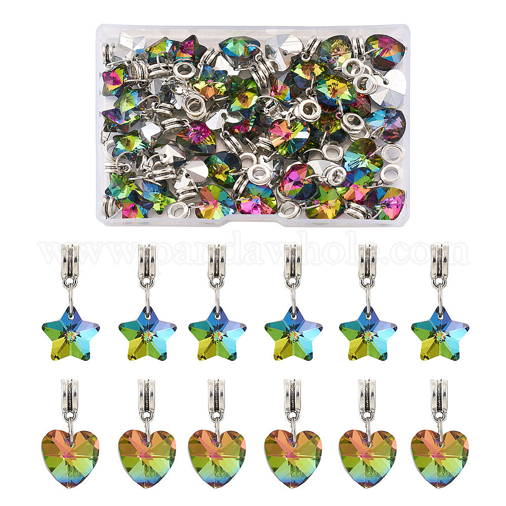 48 шт. 2 стили европейские подвески с большим отверстием из сплава, с гальваническим подвески стекла, Сердце и звезда, античное серебро