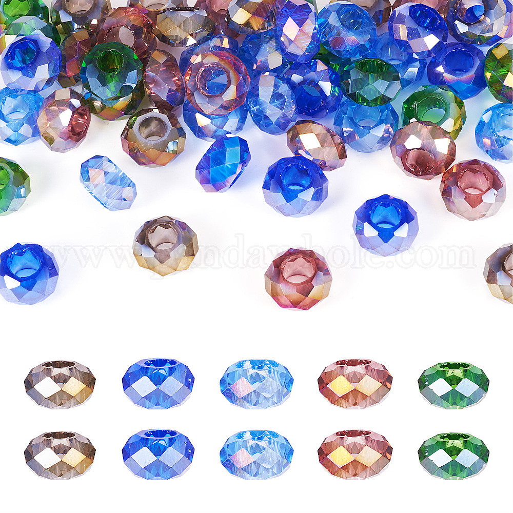 50шт 5 цвета прозрачные стеклянные европейские бусины, бусины с большим отверстием, с покрытием AB цвета, граненые, рондель