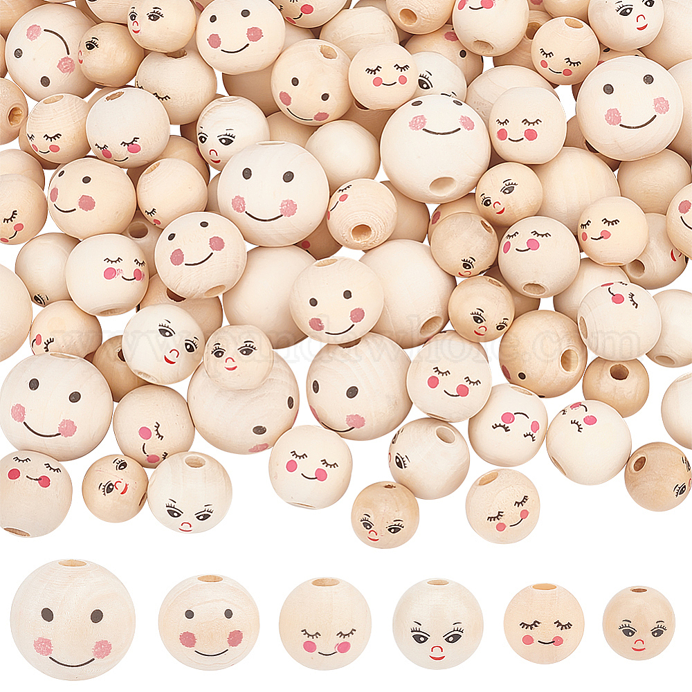 120шт 6 европейские бусины с принтом из натурального дерева, неокрашенными, бусины с большим отверстием, круглый с рисунком улыбающегося лица