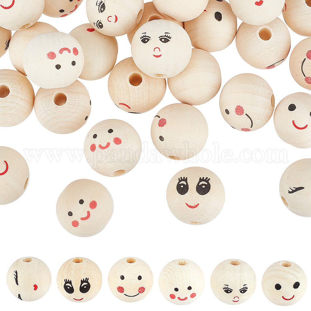 42шт 6 стили деревянные европейские бусины с принтом, Круглые бусины с большими отверстиями и рисунком улыбающегося лица, неокрашенными