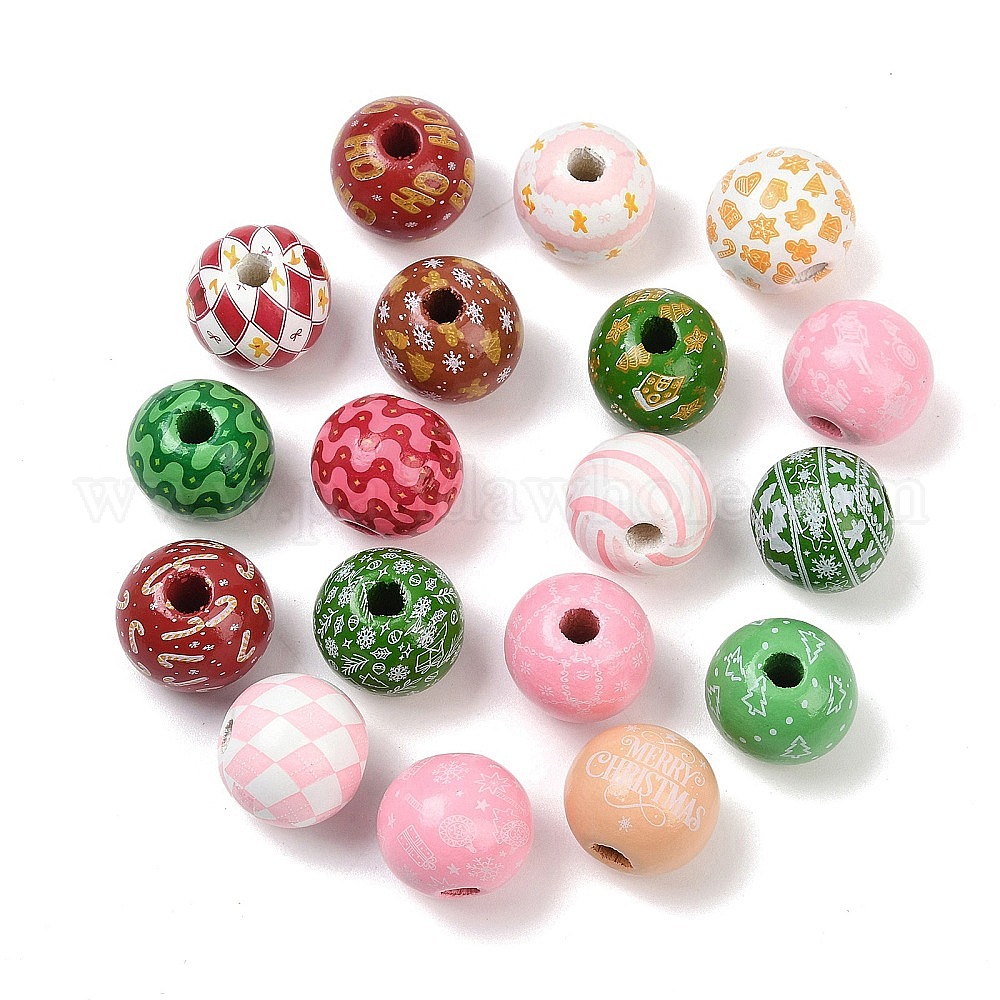• Pink Рождественские печатные европейские бусины из дерева схима, круглые, розовые, 16 мм, отверстие : 4 мм