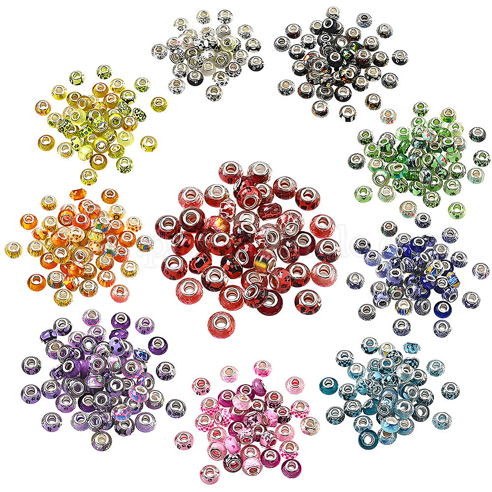 250шт. 10цвета, напечатанные на прозрачной смоле, европейские бусины, бусины с большим отверстием, рондель с латунными сердечниками, покрытыми серебром, и блестящей пудрой