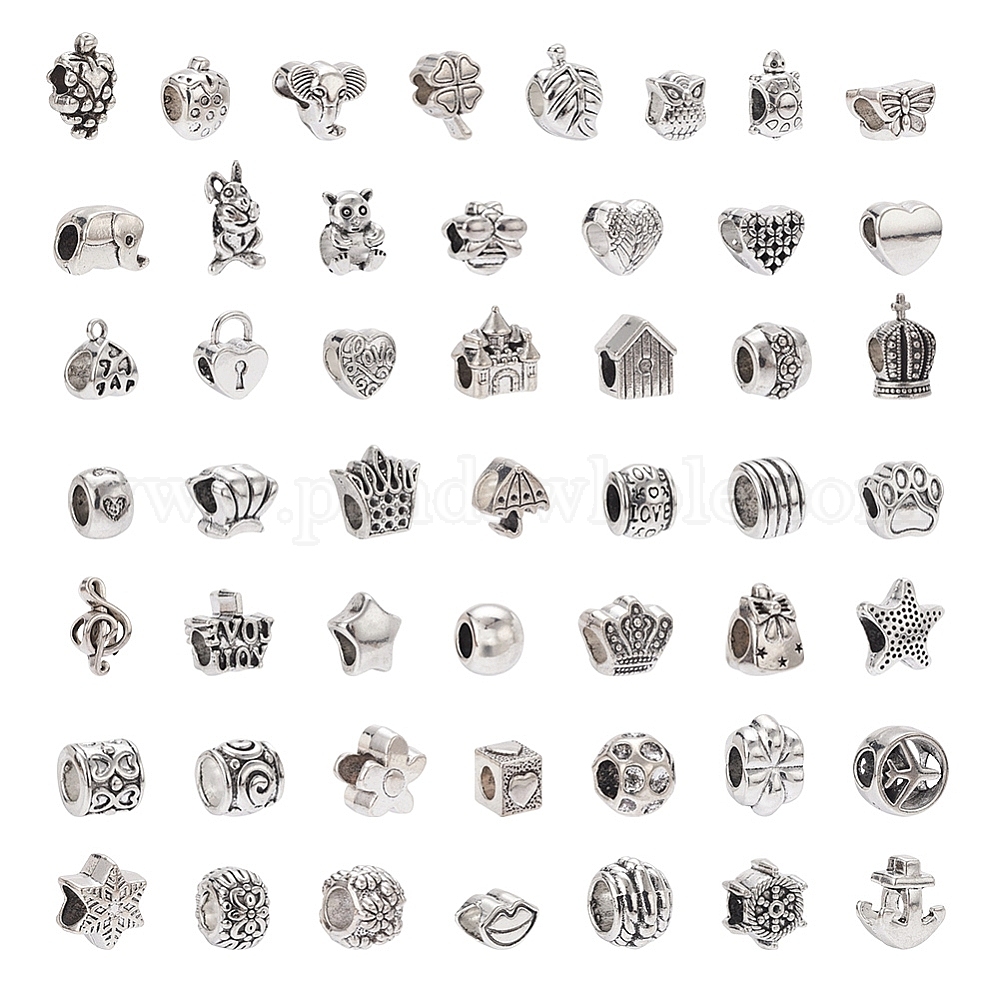 • Античное Серебро 50 шт 50 стиль европейские бусины из сплава в тибетском стиле, бусины с большим отверстием, без кадмия и без свинца, античное серебро, 1 шт / стиль