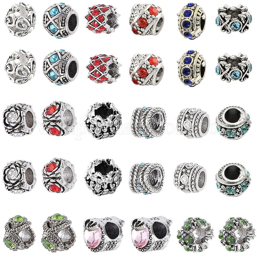 Старинное серебро покрытием сплава европейских бисер, бусины с большим отверстием, со стразами, разнообразные